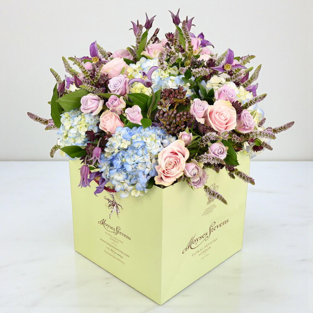 Дикие и чудесные цветы появляются по всему этому тональному букету, добавляя ему нотку очарования и дикости в этой, в остальном, классической композиции. Настоящее пиршество для глаз — будь то пушистая цветущая мята, которую вы заметите, или изящно свисающая фиолетовая клематис. Эти цветы спрятаны между великолепными синими гортензиями и сиреневыми розами. Завершённый пышной сезонной листвой, он — идеальное дополнение к этому букету в деревенском стиле.