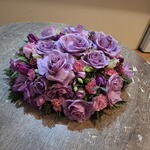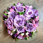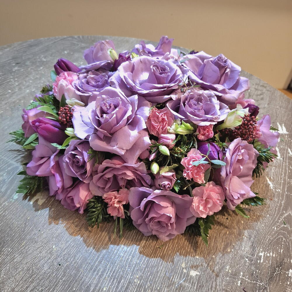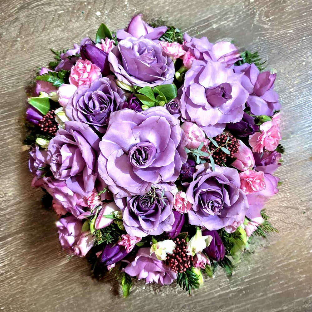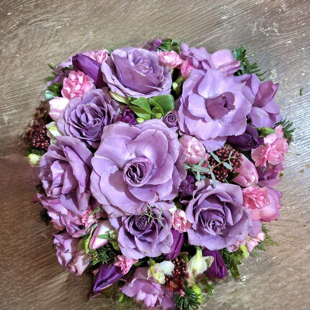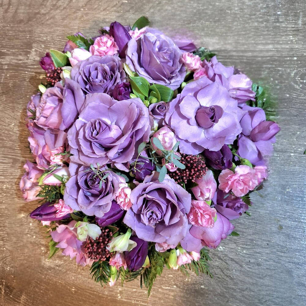 floral foam - 1 шт. eucalyptus leaves - 5 шт. кожаный лист - 10 шт. основа из флористической пены - 1 шт. Скиммия рубелла - 7 шт. роза -лиловая - 20 шт. спрей или крупная розовая гвоздика - 7 шт. тюльпаны или лизиантусы- фиолетовые - 10 шт. alstroemeria or freesia - 5 шт.