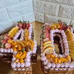 Торт у формі цифри з прошарками зі свіжого крему та фруктовим декором. Бісквіт шоколадного смаку. Можуть бути будь-які цифри за запитом.