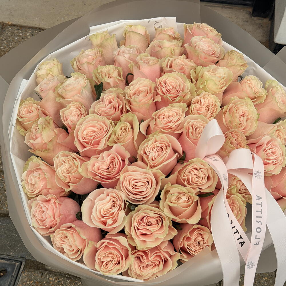 Вражаючий букет із 50 персикових троянд, вишукано оформлений у преміальну упаковку. Ніжні персикові відтінки створюють м'який, теплий і елегантний вигляд. Ідеально підходить для вираження кохання, вдячності або святкування особливої миті з вишуканим і позачасовим квітковим подарунком 🌸✨