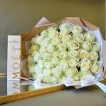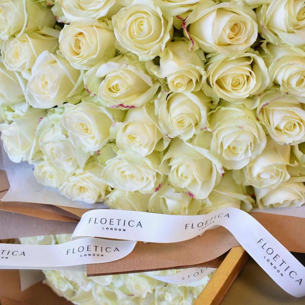 Класична біла троянда, зв'язана вручну з білих троянд найвищої якості, представлена та доставлена вручну в розкішній сумці Floetica. *Шампанське не входить до комплекту та доступне як додаткові аксесуари.