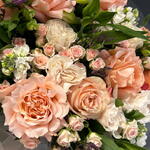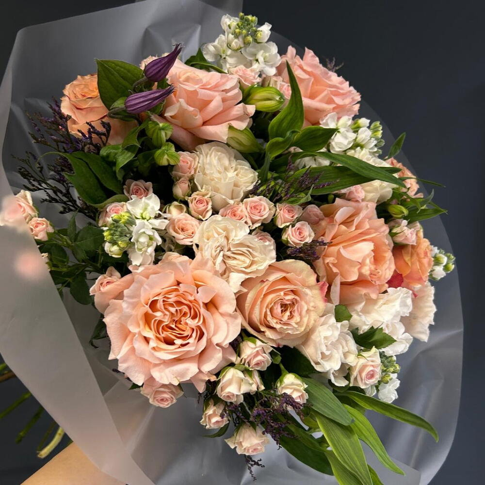 Matiola - 4 шт. Clematis - 1 шт. pink spray rose - 3 шт. white peony rose - 5 шт. pink peony rose - 8 шт. limonium purple - 2 шт.