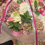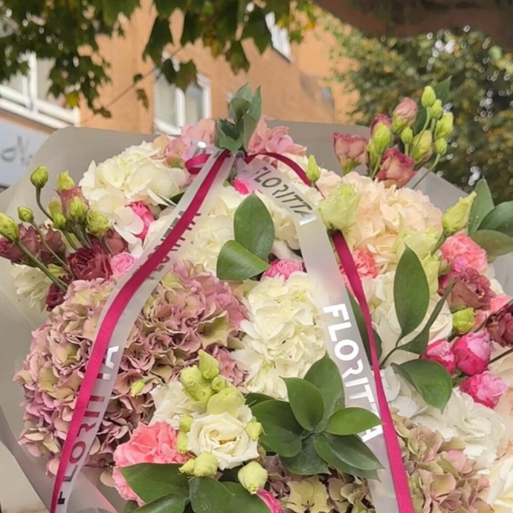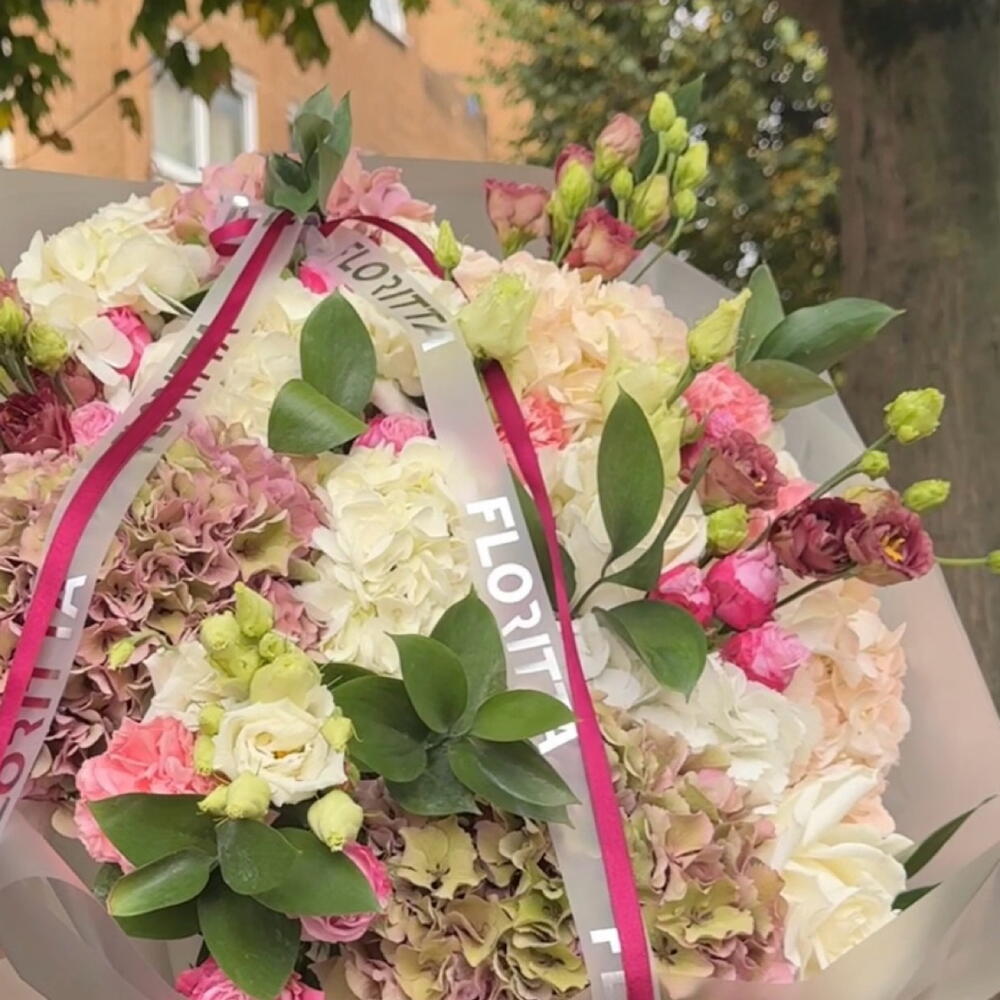 Eustoma - 4 шт. Greenery - 3 шт. Hydrangea - 6 шт. spray roses - 3 шт.