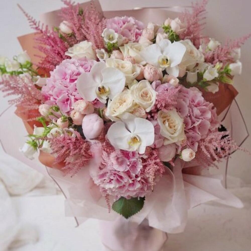 white lisianthus - 5 шт. pink hydrangeas - 3 шт. pink astilbe - 10 шт. white roses - 10 шт.