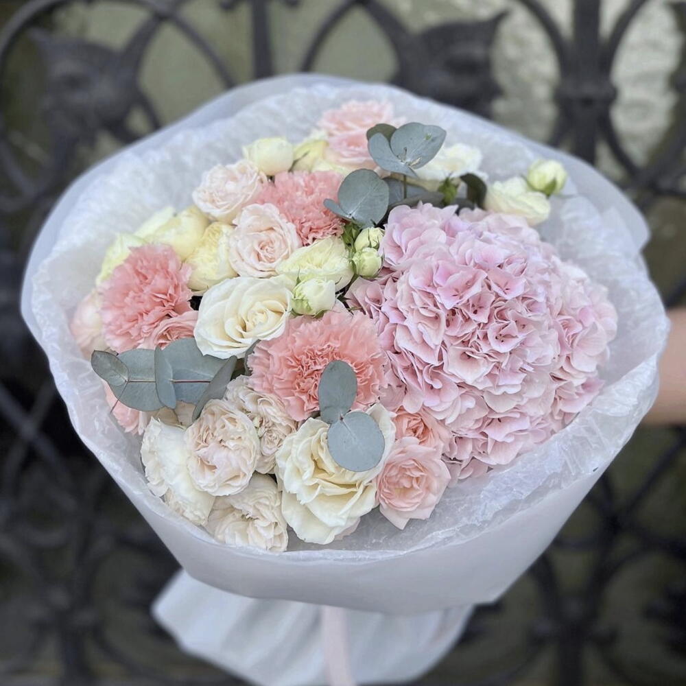 Eustoma - 3 шт. Eucalyptus - 4 шт. Hydrangea - 2 шт. корнатіон - 5 шт. roses - 5 шт.