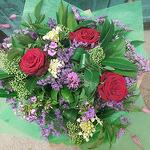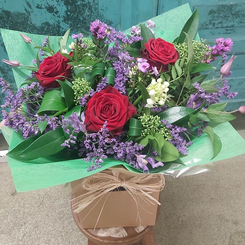 Яскраво-фіолетовий та червоний букет включає червоні троянди на довгому стеблі, фіолетовий лімоніум, суміш сезонних фіолетово-зелених квітів та масив пишної зеленої листя. Упаковка «Аква», букет доставлений у воді. Доставка наступного дня. Зверніть увагу, що через сезонну наявність квітів, можливо, доведеться відрізняти окремі квіти від показаних. Ми можемо замінити квіти на аналогічні за стилем, якістю та вартістю.