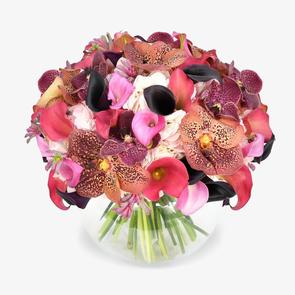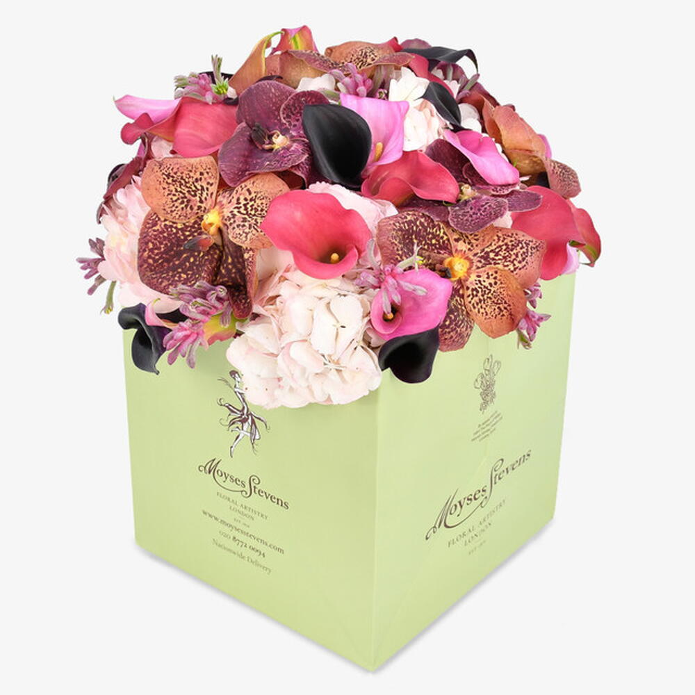 Luxury blooms at their finest. Deep rich colours form this arrangement. Whether its the deeply tones Calla lilies (in 3 beautiful shades) or equally bold and striking Vanda Orchids. This mix of purples, speckled blooms and dark velvety tones are framed beautifully a backdrop of white hydrangeas and finished with our hand tied ribbon.