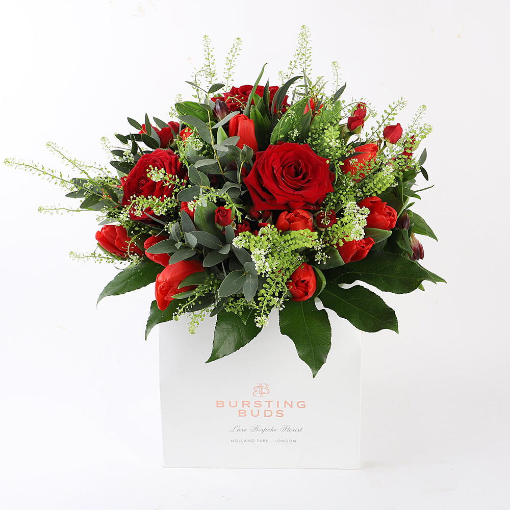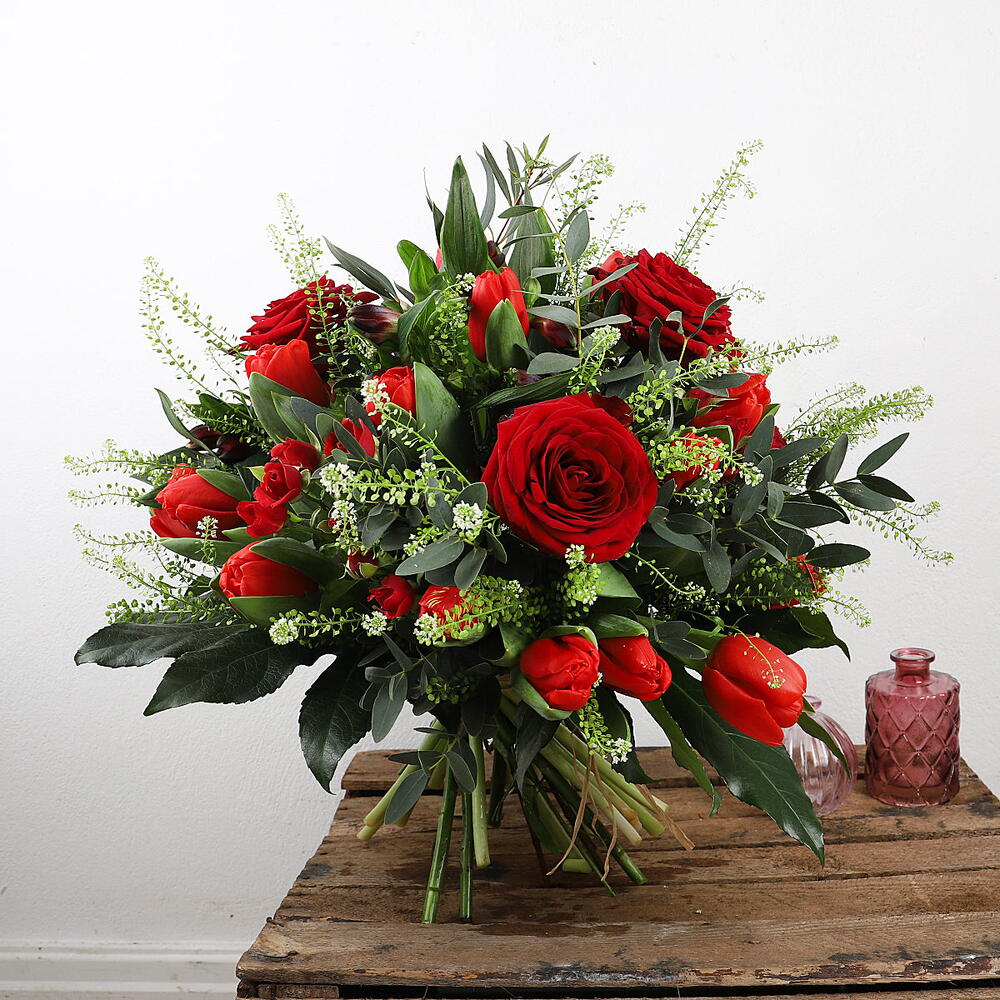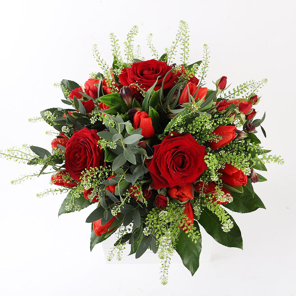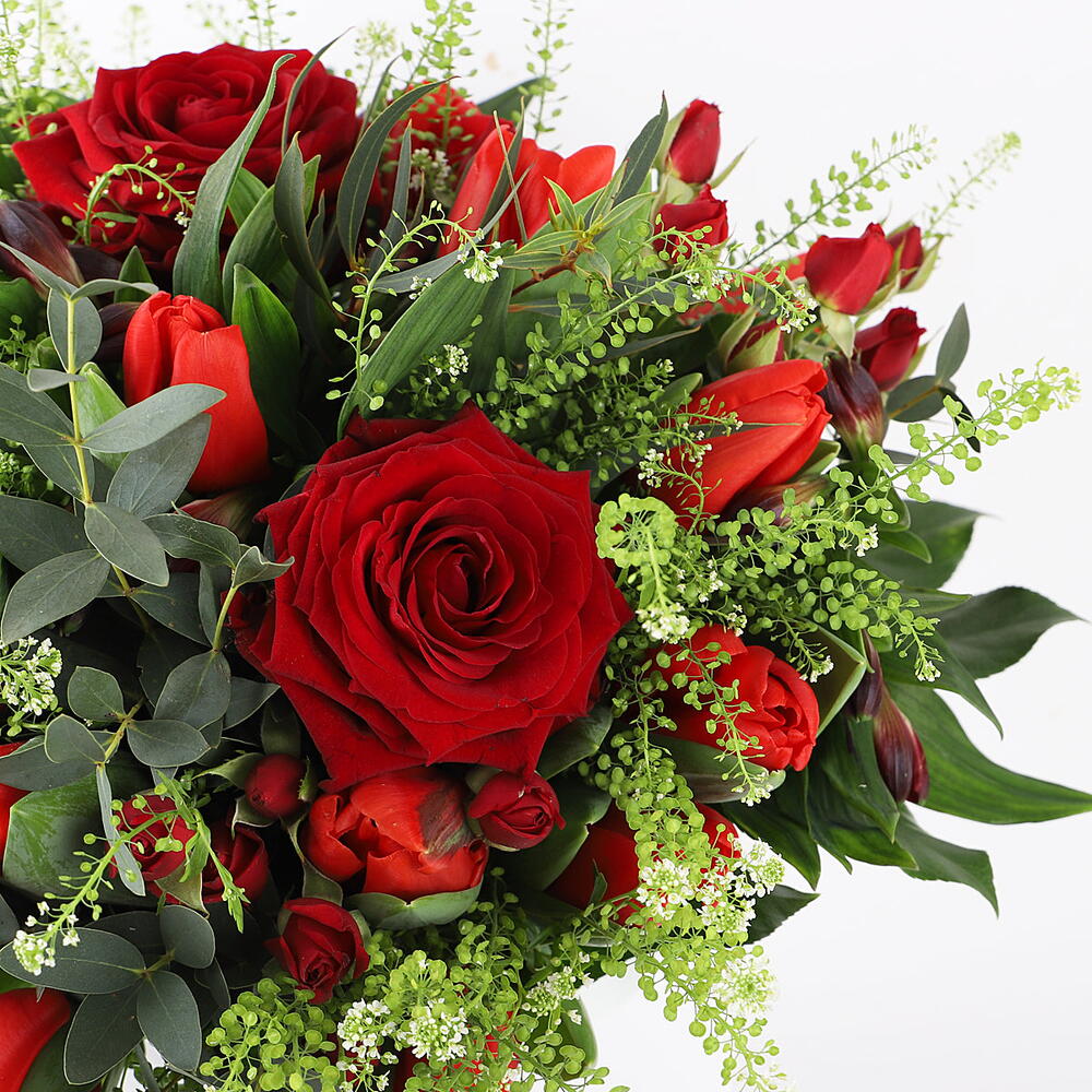 Цей приголомшливий букет містить насичені червоні троянди та яскраві червоні тюльпани, що символізують кохання, пристрасть і тепло. Насичені відтінки червоного красиво доповнені ніжним зеленим листям і м’якими акцентами зелені, створюючи збалансований і гармонійний вигляд. Чи то на річницю, чи на День святого Валентина, чи просто щоб показати комусь, що вам не байдуже, цей букет передає вічне послання прихильності й елегантності. Професійно оформлена, ця розкішна композиція ідеально підходить, щоб зробити будь-яку подію по-справжньому особливою.