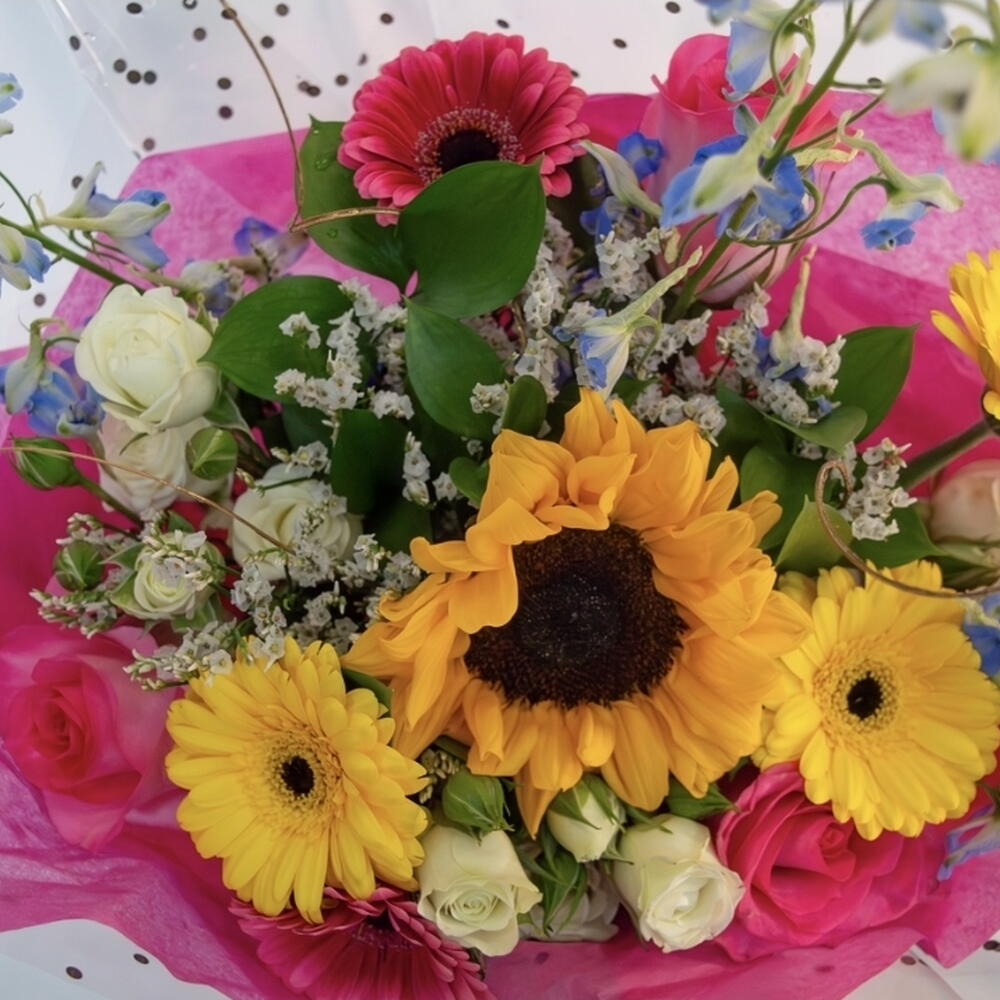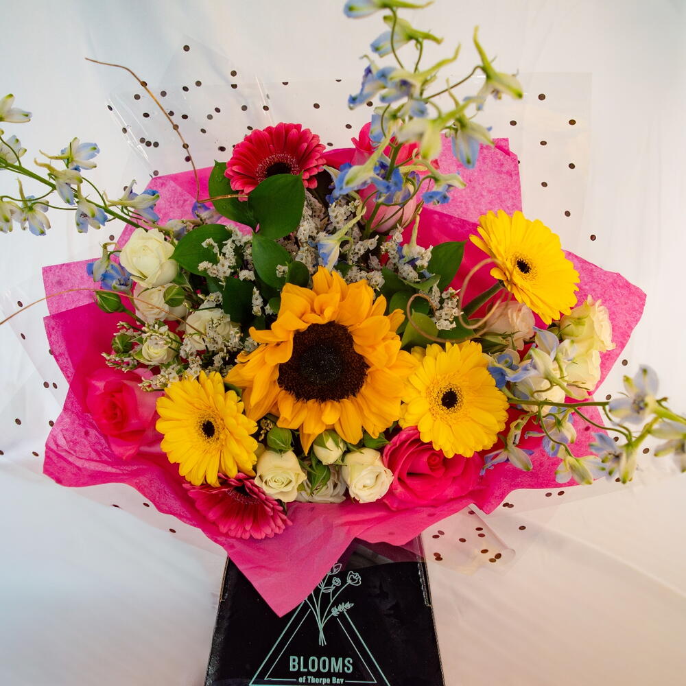A bright and contemporary mix featuring blue delphinium, pink and white roses, cheerful sunflowers, pink and yellow germini, and white limonium. Accented with touches of gold tingting, this bouquet bursts with colour and confidence—perfect for celebrations or adding a bold statement to any space.