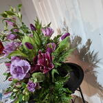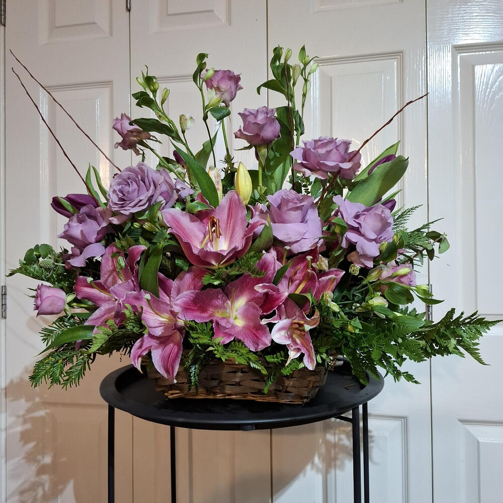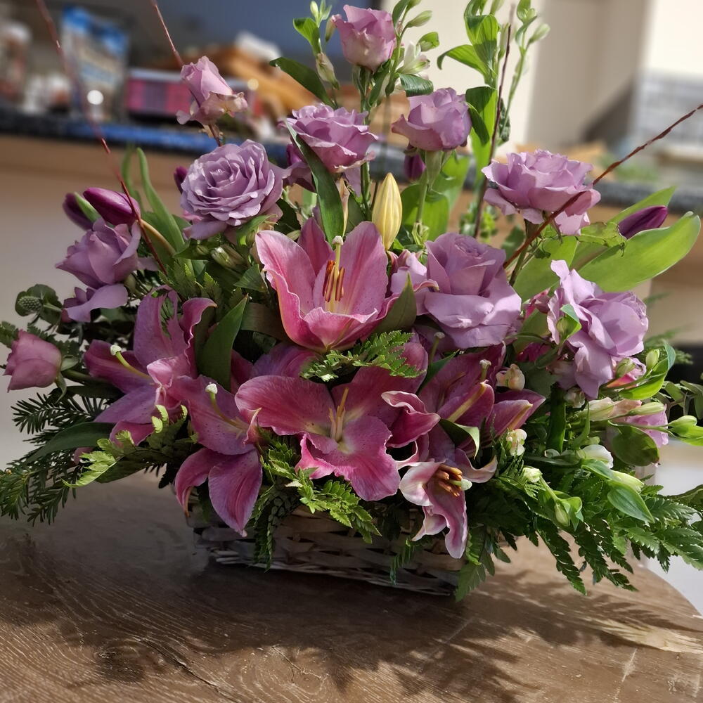 Eringium - 4 шт. Basket - 1 шт. alstroemeria white - 4 шт. floral foam (oasis) - 1 шт. рожеві лілії - 4 шт. вибір зелені - 20 шт. рози лілового кольору - 10 шт. троянди рожеві/ бузкові - 7 шт. тюльпани фіолетові/ лілові - 10 шт.