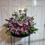 Ця композиція з кошика містить чудові бузкові троянди, рожеві лілії, кілька фіолетових тюльпанів, чудовий вибір зелені та будяків (ерінгіум). Композиція підходить для багатьох подій, таких як вечірка, церква, весілля, подарунок на швидке одужання або навіть для вашого дому. Оскільки композиція розміщена в квітковій піні в кошику з підкладкою, за нею легко доглядати, і вона не проллється. Вона не тільки приваблива, але й зручна.