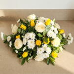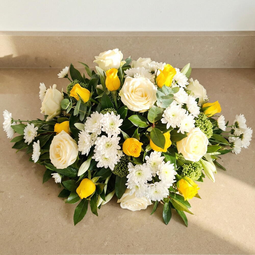 This elegant and touching arrangement of funeral flowers comprises of a grand combination of 15 pristine White Roses and 15 vibrant Yellow Roses, symbolizing pure love and heartfelt respect. Included also are 10 delicate Alstroemeria or Eustoma and 7 tender White Tulips signifying eternal love and heaven. 8 White Chrysanthemums stand for truth and 8 lush Fatsia leaves add to the verdancy of the arrangement. Complementing these are the delicately curled 7 Eucalyptus leaves, renowned for their peaceful aura, and 8 clusters of vibrant Skimmia green, providing a refreshing and calming undertone. This arrangement is a symbol of peace, soothing the soul in times of mourning - a beautiful way to express respect, solidarity, and deepest sympathies during challenging times.