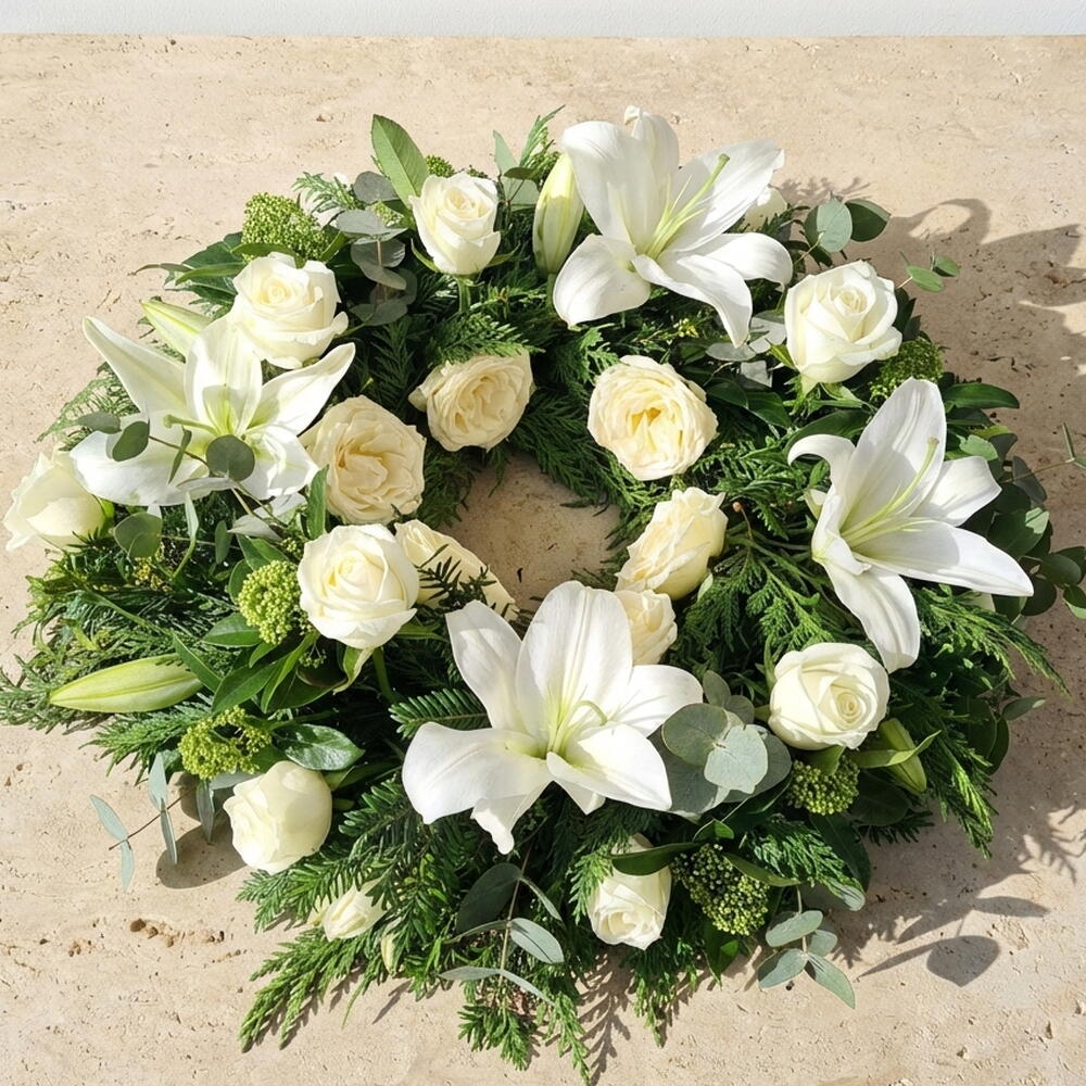 Представляємо безтурботну та щиру колекцію похоронних квітів, делікатно аранжованих для автентичного вираження співчуття. Композиція може похвалитися 30 великими біло-кремовими трояндами, що символізують повагу та чистоту кохання. Троянди супроводжують шість елегантних білих лілій з розкритими бутонами, які обожнюються за свій аромат та відомі тим, що передають відновлену невинність душі померлого. Цей букет оточений рясною зеленню, включаючи міцне листя евкаліпта, яке надає йому зворушливого, свіжого аромату, та 15 гілок скімії, відомої своєю стійкою красою протягом зимових місяців, що символізує вічне кохання та спогади. Цю багату квіткову суміш підтримує вінок з 14 пінопластових кілець, що забезпечує симетричну та міцну структуру для цих зібраних вручну квітів.