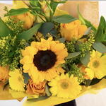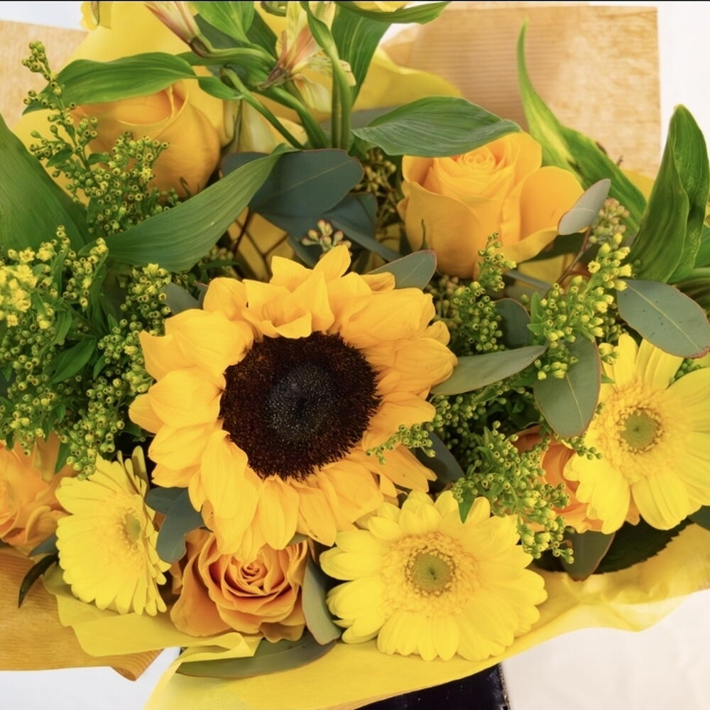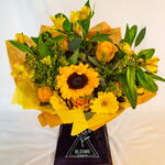 Цей букет, що сповнений життєрадісних кольорів, містить яскраві соняшники, яскраві троянди, герміні, альстромерії та золотисті солідаго. Випромінюючи тепло та позитив, він ідеально підходить для підняття настрою та створення сонячного світла на будь-якій події.