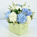 Цей мрійливий букет сповнений надзвичайно великих гортензій, воскових квітів та сезонної зелені. Великі пухкі суцвіття в чудових блакитних і білих тонах, цей мінімалістичний букет демонструє найкращі риси гортензії у вражаючому й класичному букеті.