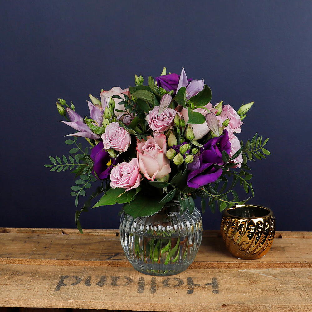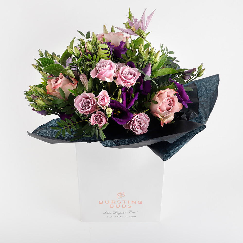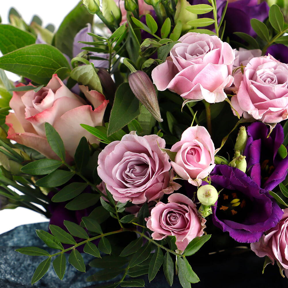 Цей чарівний букет містить ніжні рожеві троянди, елегантні фіолетові лізіантуси та різноманітну пишну зелень, що створює заспокійливий, гармонійний вигляд. Ніжні відтінки троянд і лізіантусів ідеально поєднуються, надаючи цій композиції вишуканого та спокійного шарму. Ідеально підходить для будь-якої нагоди, цей букет справить тривале враження своєю граціозною красою та витонченою палітрою кольорів. Акуратно аранжований і запакований, він обов'язково принесе радість і елегантність у будь-який простір.