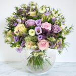 Чарівна пастельна палітра втілює цей чарівний дизайн; троянди та лізіантус займають почесне місце. Насичений фіолетовий лімоніум підкреслюється білою чорнушкою в химерній квітковій композиції. Доповнений сезонною зеленню, цей букет оживить будь-який дім.