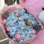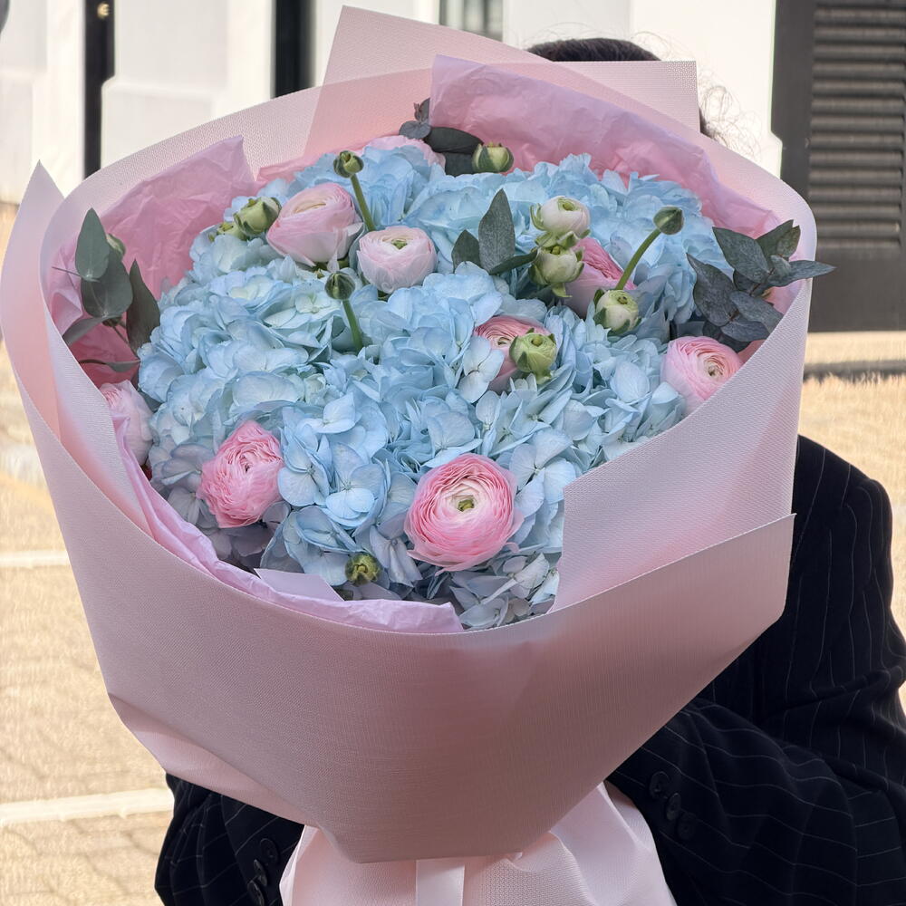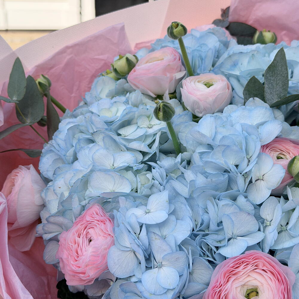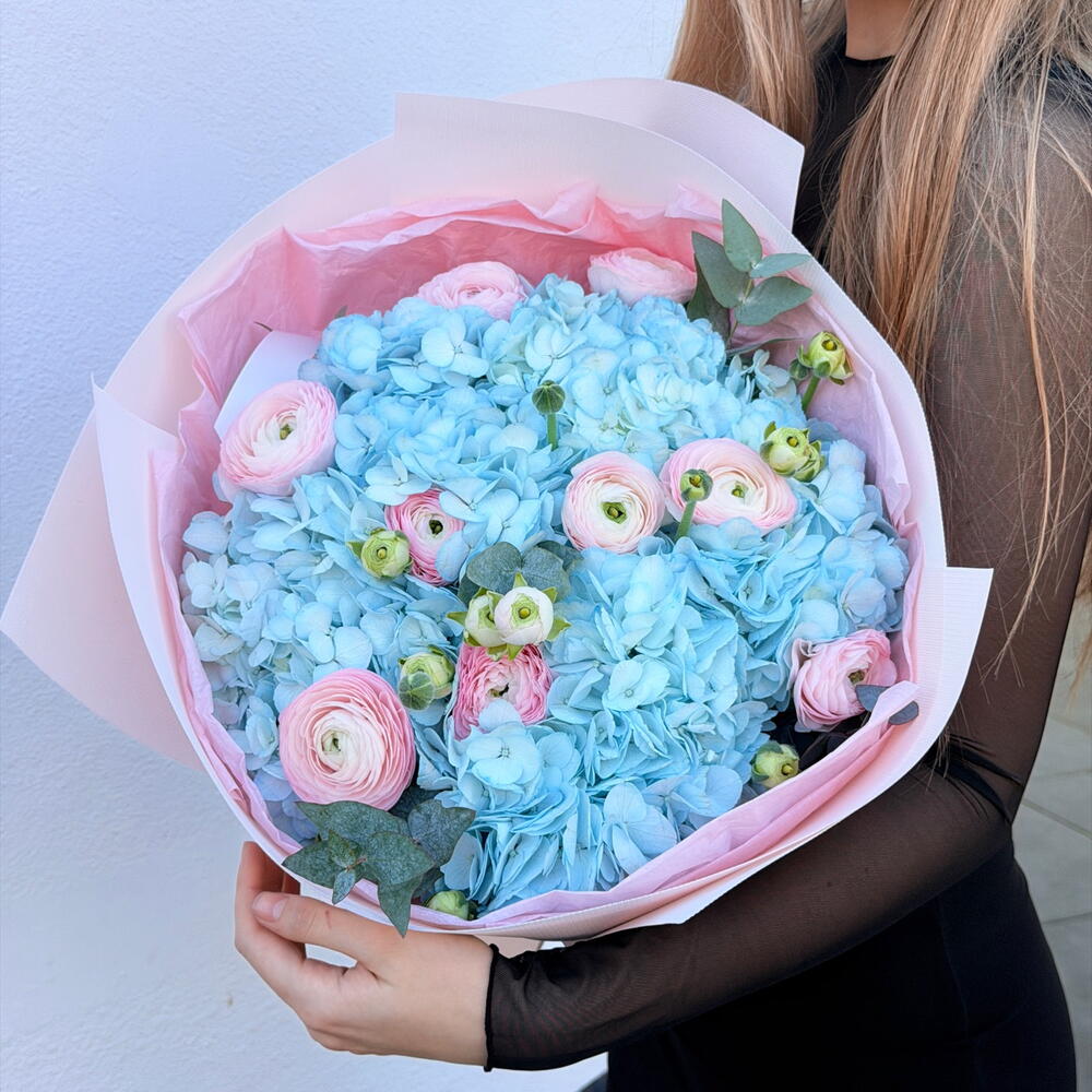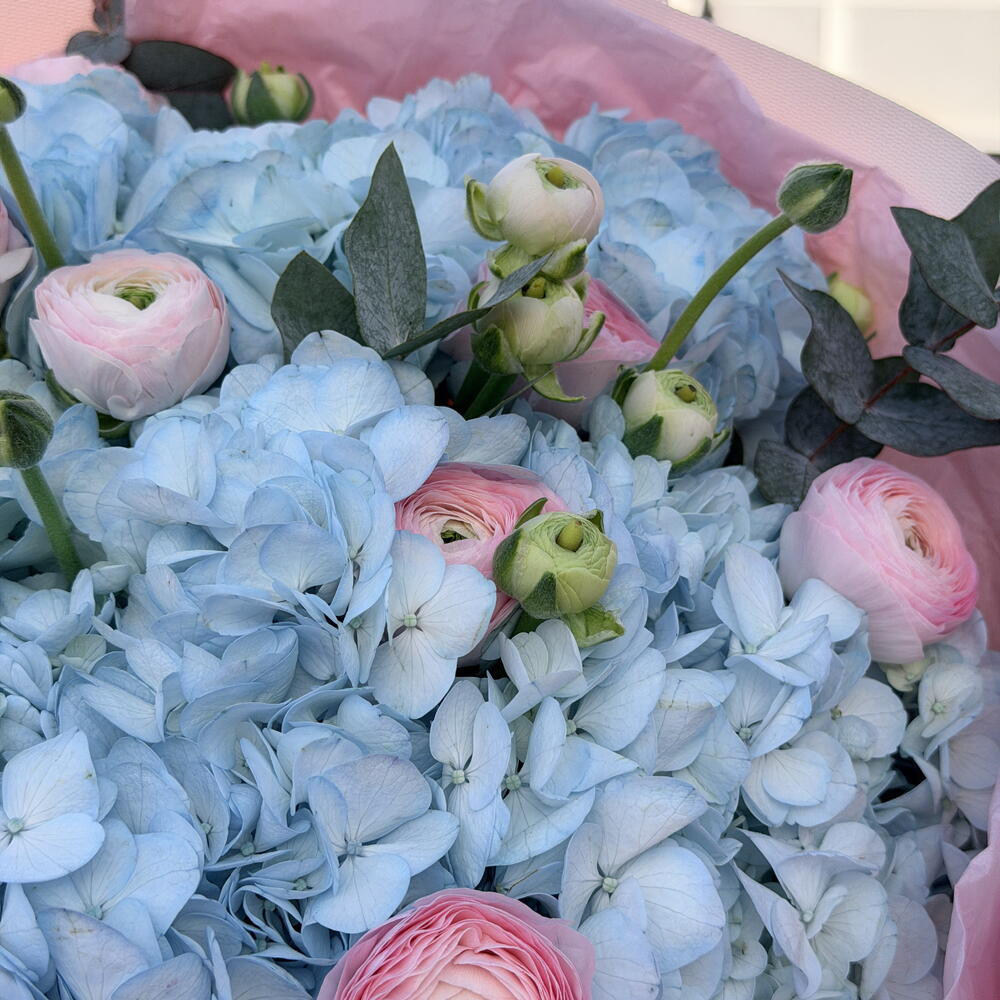Розкішний букет з 7 синіх гортензій у поєднанні з ніжними рожевими ранункулусами та свіжим евкаліптом. Ніжні пастельні тони створюють елегантну та романтичну композицію, красиво упаковану в преміальний папір. Ідеально підходить для днів народження, святкувань і особливо для Міжнародного жіночого дня.