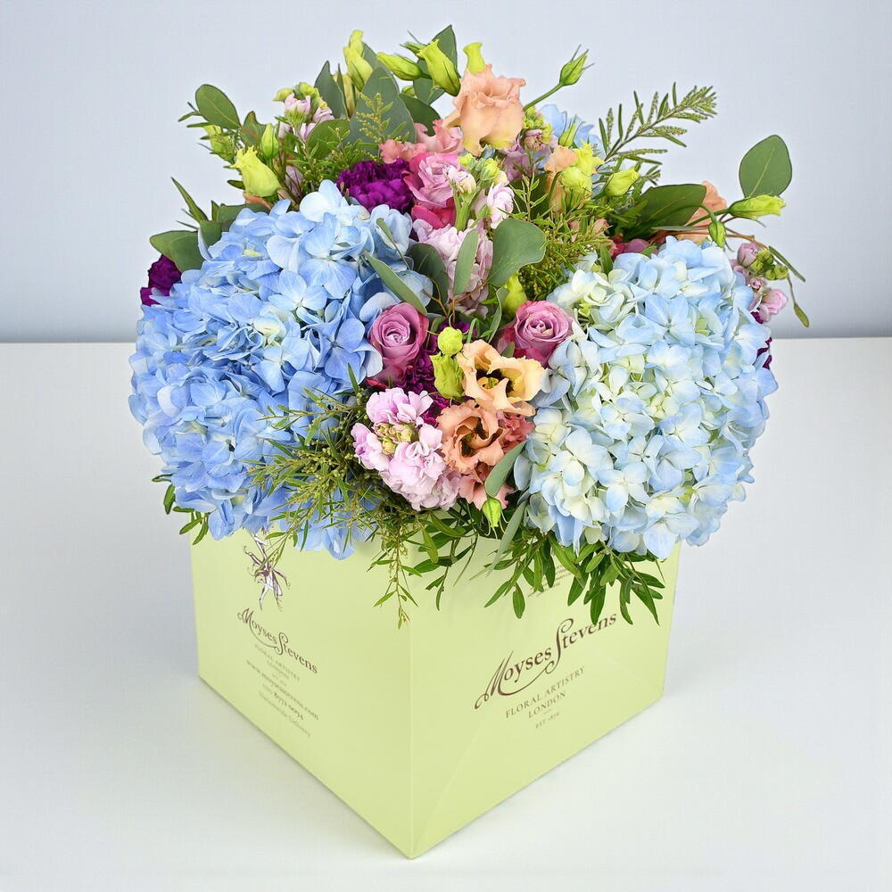 Класичний букет Мойсеса з блакитними гортензіями, чудовими тьмяними трояндами, цибулями, сезонним листям гвоздик