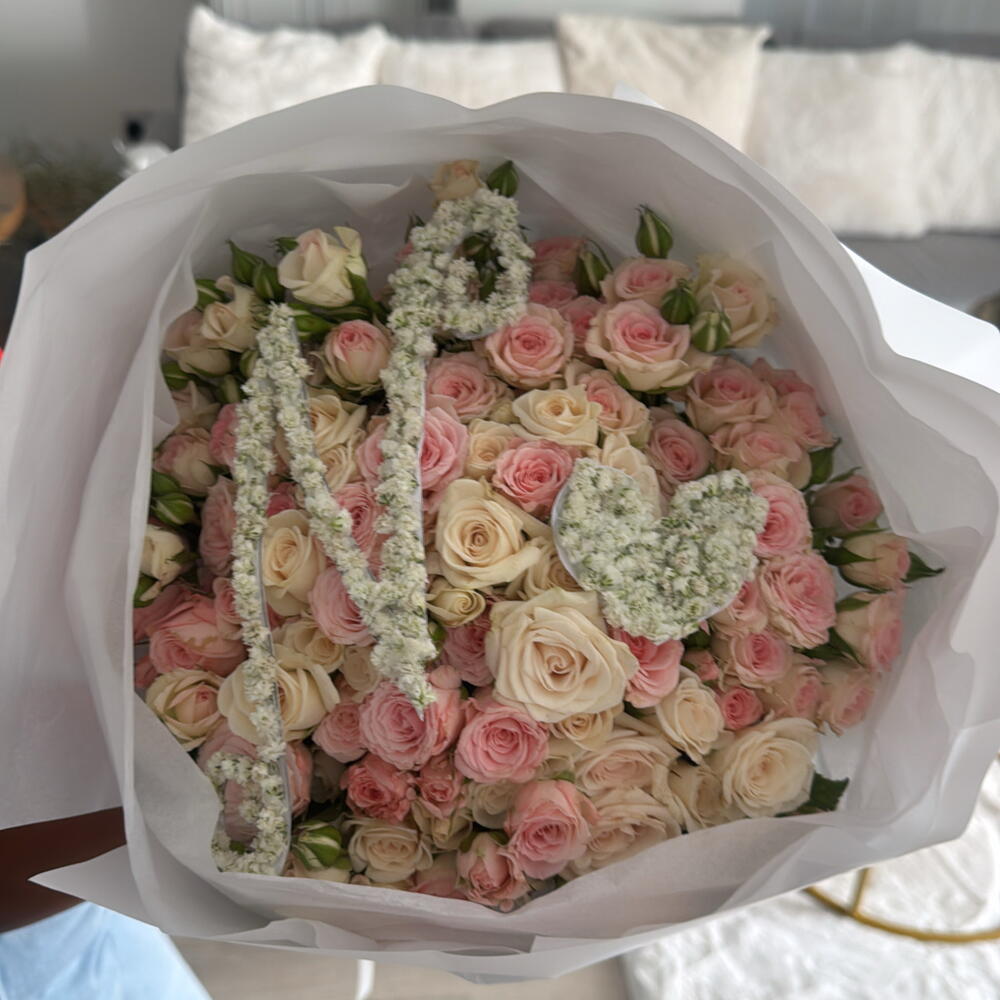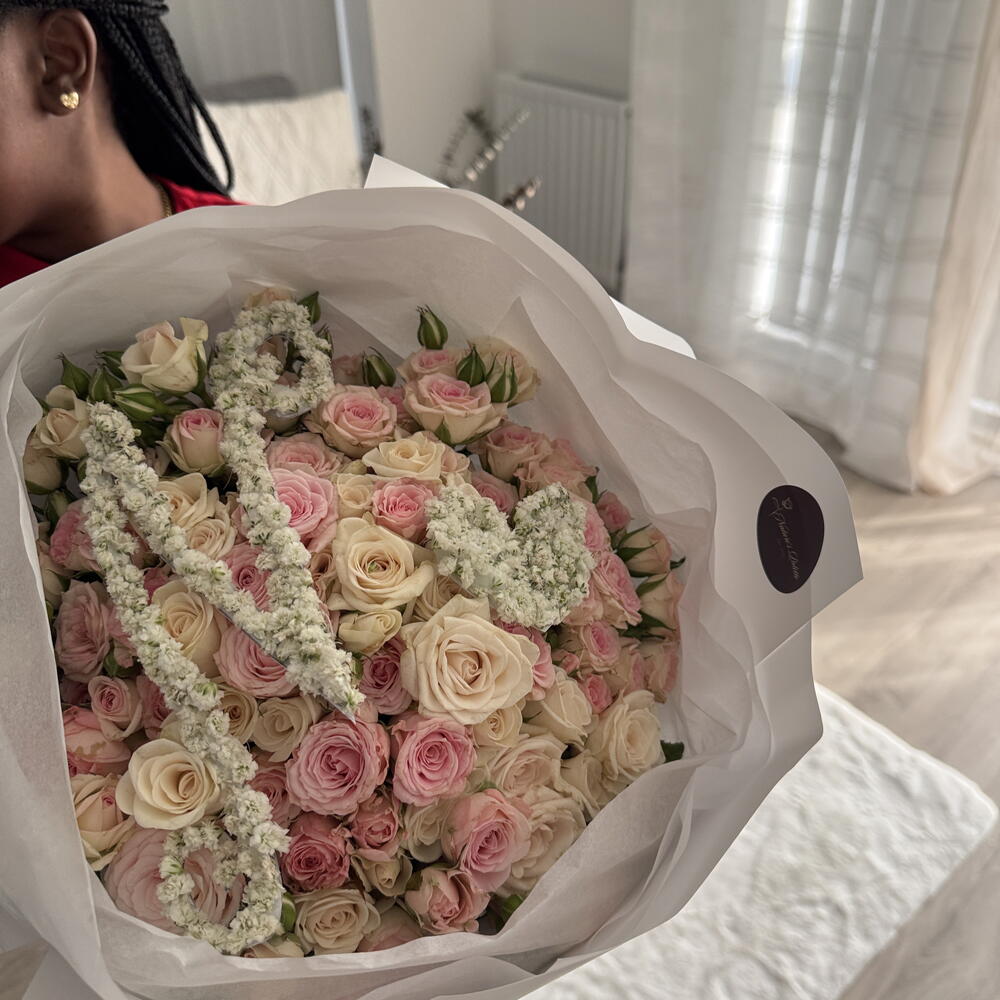рожева спрей-троянда - 10 шт. біла спрей-роза - 15 шт. білі філери - 20 шт.