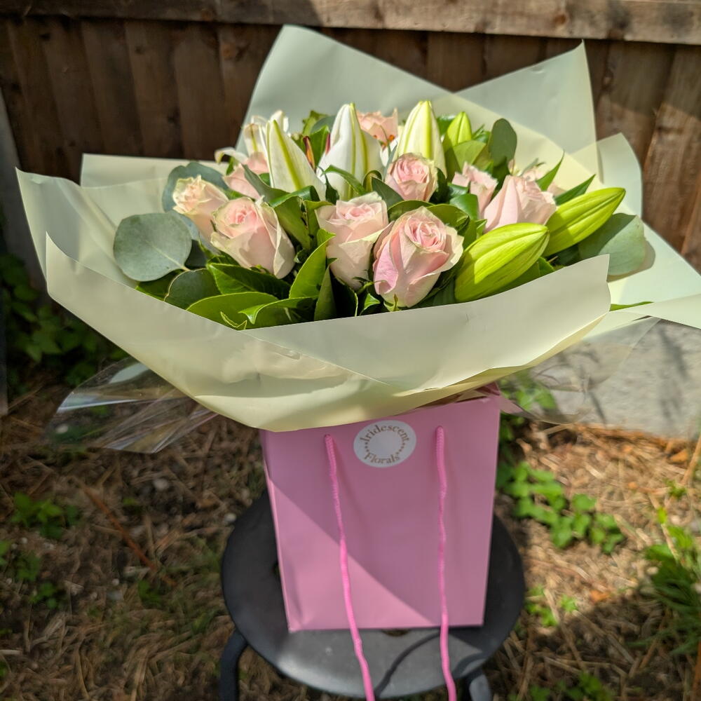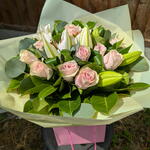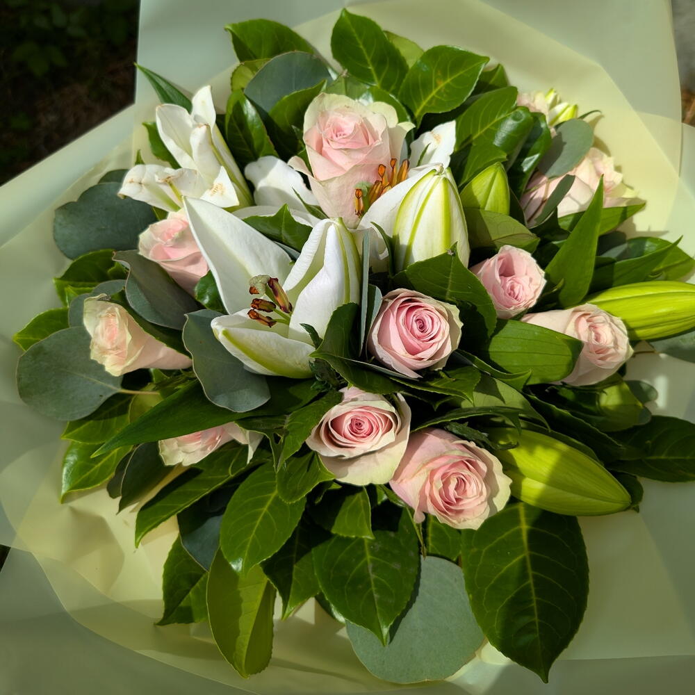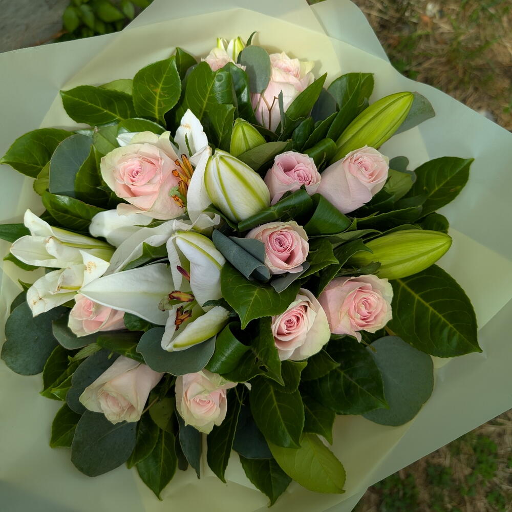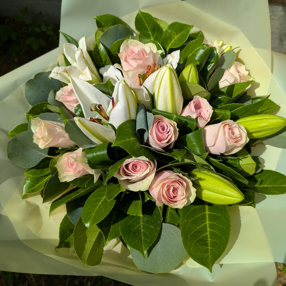 Pink roses and white lillies bouquet