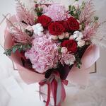 Eucalyptus - 5 шт. pink hydrangeas - 2 шт. pink astilbe - 5 шт. red roses - 5 шт.