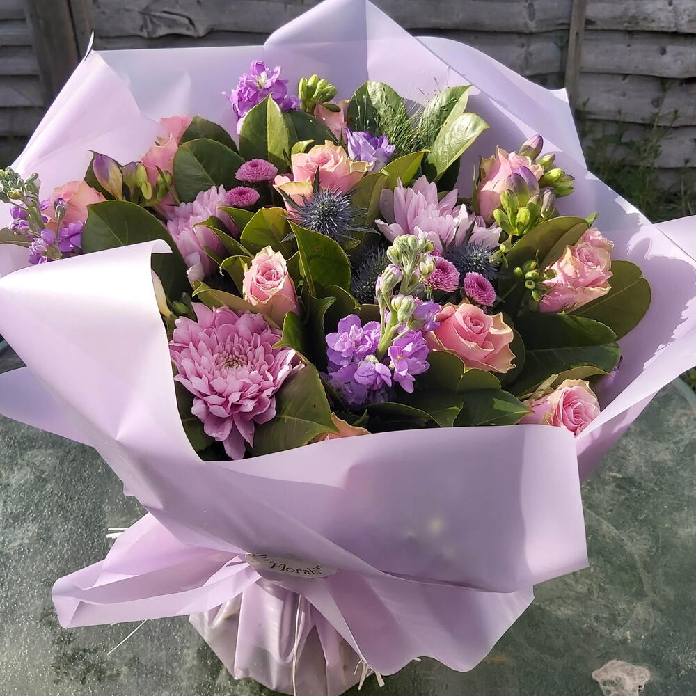 Фіолетово-рожевий букет, наповнений рожевими трояндами на довгих стеблах, фіолетовими хризантемами з великими головками, блакитним будяком, сезонними фіолетовими квітами та сумішшю пишного зеленого листя. Упаковка «Аква», букет доставлений у воді. Букет, зображений на фото, має надзвичайно великий розмір — ваш букет буде того ж стилю, але меншого розміру. Доставка наступного дня можлива. Зверніть увагу, що через сезонну наявність квітів, може знадобитися відрізняти окремі квіти від зображених. Ми можемо замінити квіти на аналогічні за стилем, якістю та вартістю.