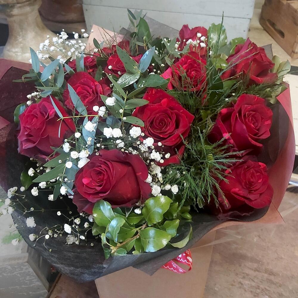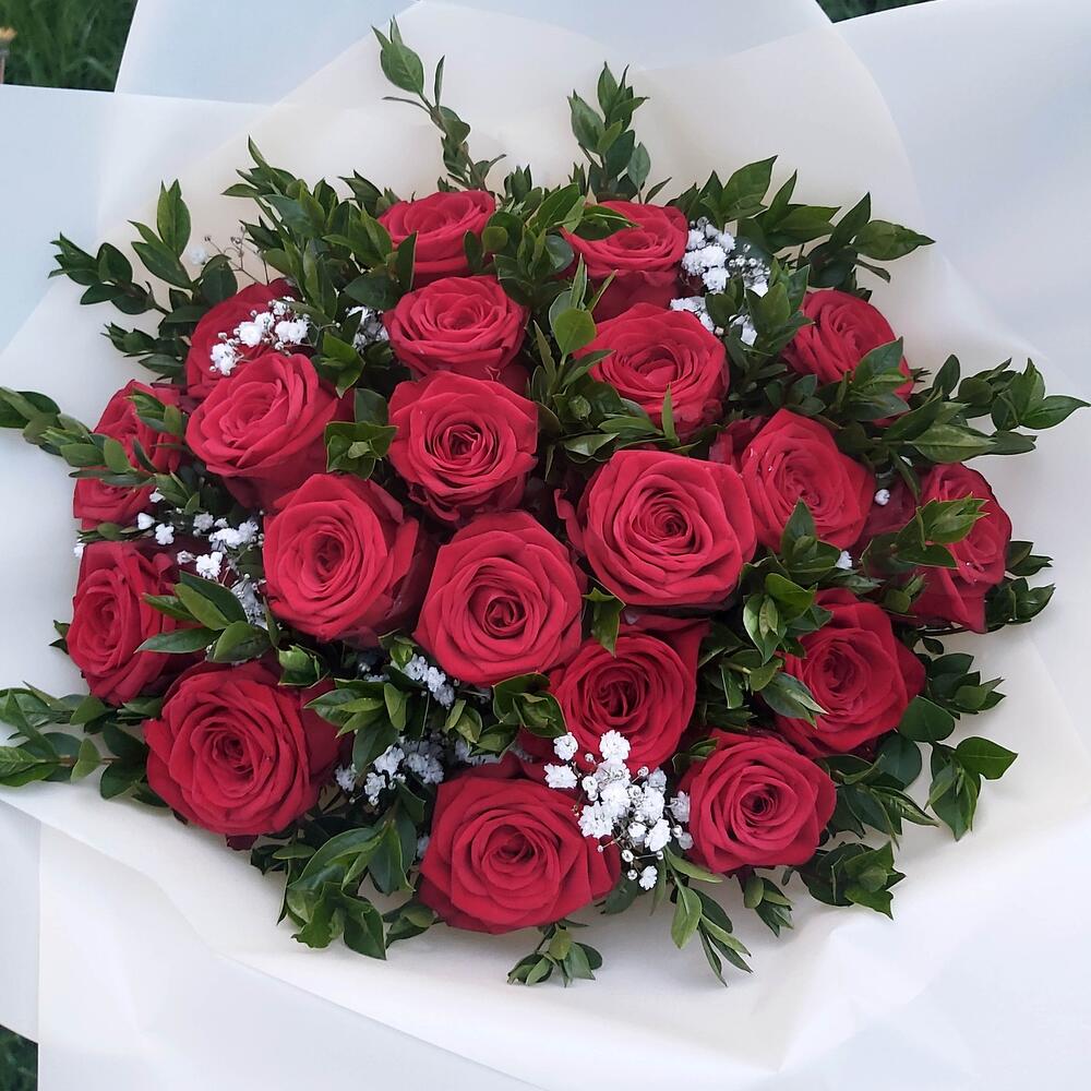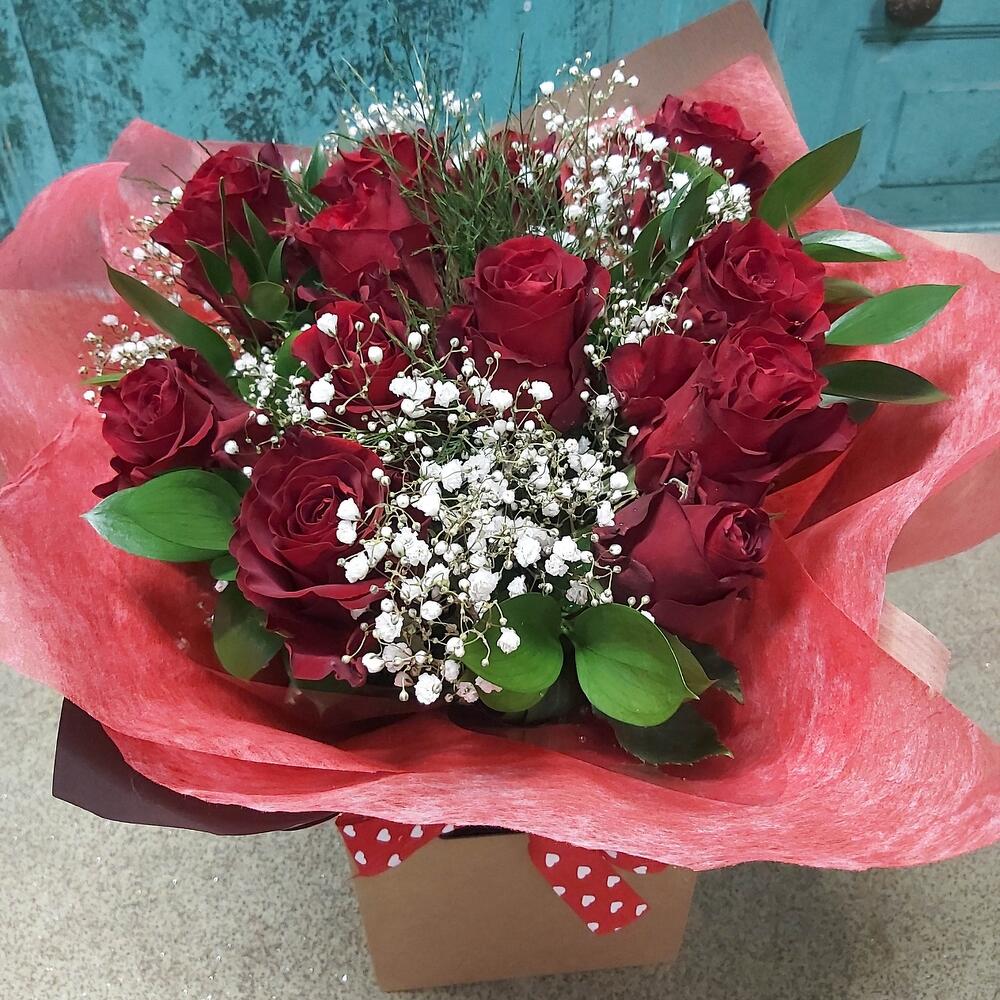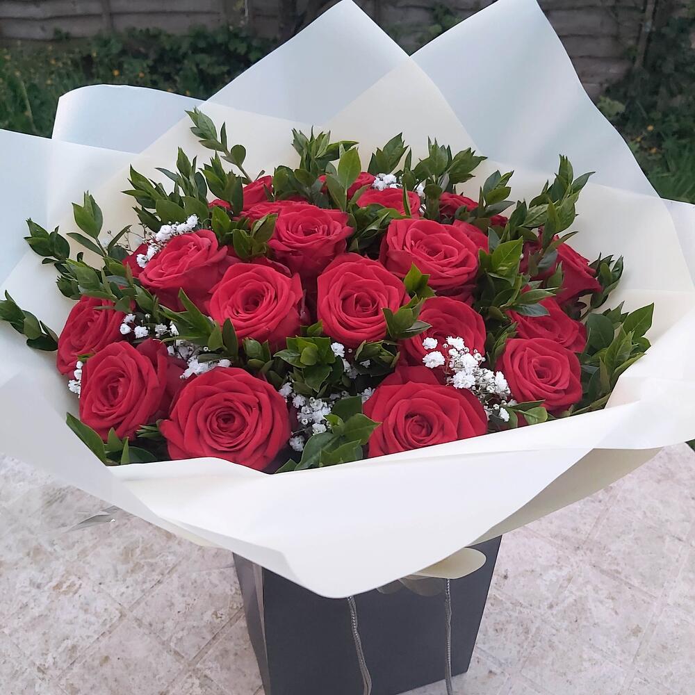 Букет червоних троянд, наповнений червоними трояндами на довгих стеблах та пишною мікс-зеленню. Упаковка Aqua, букет доставлений у воді. Букет, зображений на фото, великого розміру. - ваш букет буде того ж стилю, але меншого розміру. Доставка наступного дня можлива. Зверніть увагу, що через сезонну наявність квітів, може знадобитися відрізняти окремі квіти від показаних. Ми можемо замінити квіти на аналогічні за стилем, якістю та вартістю.