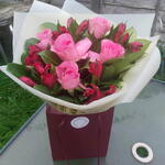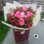 Букет з троянд та альстромерій включає рожеві троянди на довгому стеблі, червоні альстромерії та пишну мікс-зелень. Упаковано у водну фарбу, букет доставлено у воді. Доставка наступного дня. Зверніть увагу, що через сезонну наявність квітів, можливо, доведеться відрізняти окремі квіти від показаних. Ми можемо замінити квіти на аналогічні за стилем, якістю та вартістю.