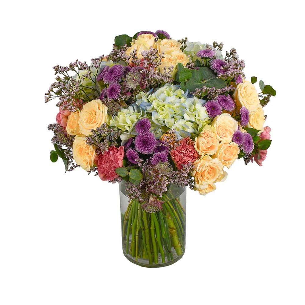 Limonium - 4 шт. santini - 4 шт. pink carnations - 4 шт. blue hydrangea - 2 шт. spray roses - 5 шт. сезонна зелень (пучок) - 1 шт.