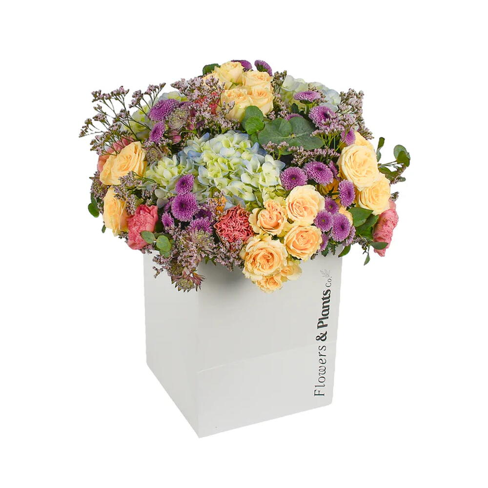 Енергійна композиція з великою кількістю шарму. У складі: гвоздики, гортензії, кустові троянди та інше.
