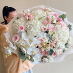 Hydrangea - 12 шт. Lisianthus - 10 шт. Leaves - 5 шт. Orchid - 2 шт. pink roses - 20 шт.