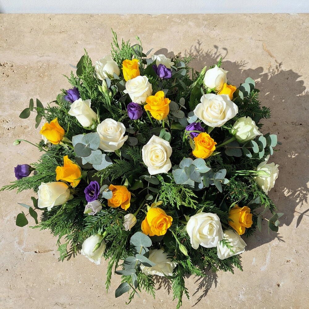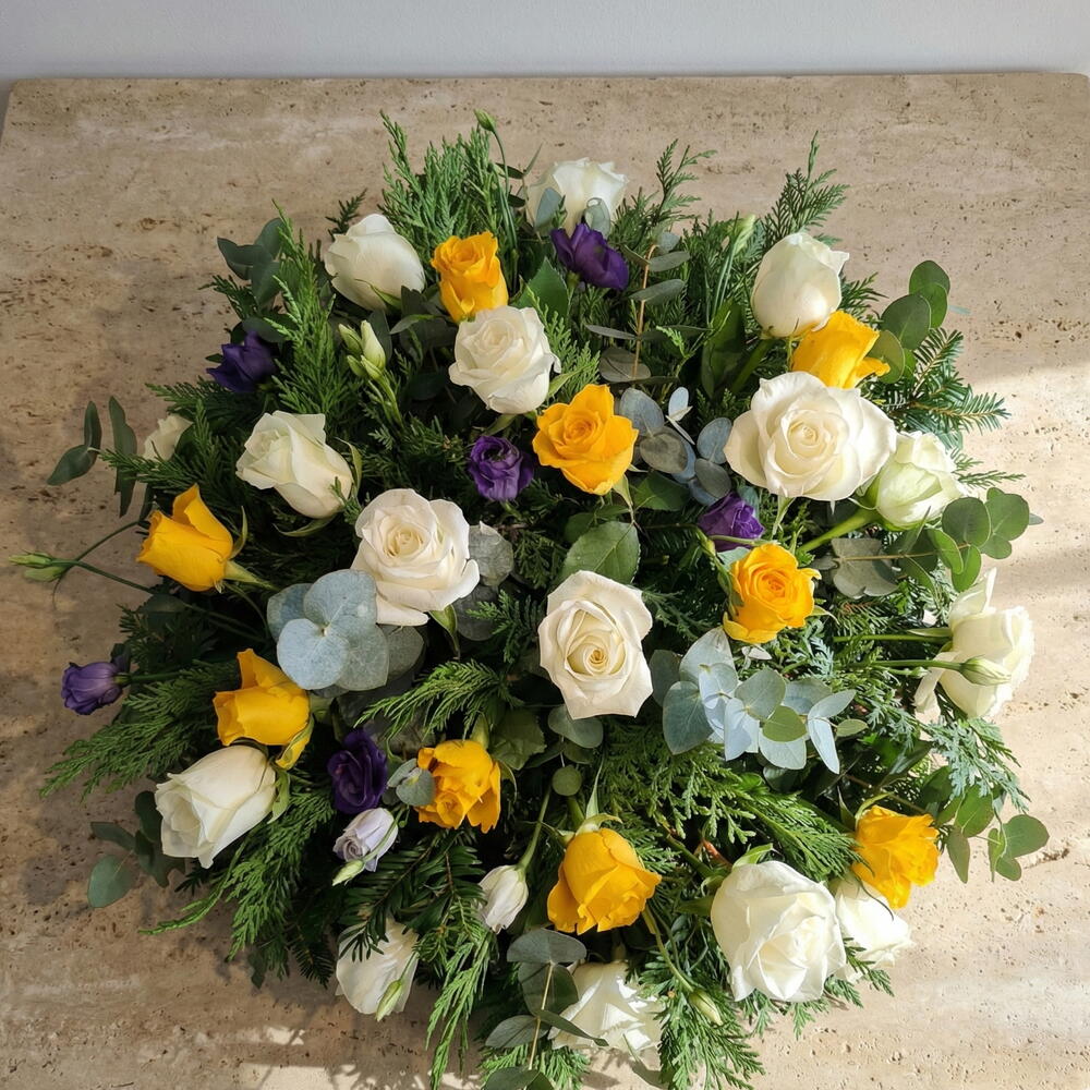 Ця елегантна композиція з траурних квітів – ніжний жест співчуття та співчуття. Створена з 20 бездоганних білих троянд, 9 яскраво-жовтих троянд та 4 фіолетових лізіантусів, вона пропонує зворушливий символ любові та поваги. Букет пом'якшений листям евкаліпта та добірним міксом рослин, ретельно розміщених на пінопластовій основі в підносі, щоб передати природну красу та спокій. Висловте свої щирі співчуття та вшануйте пам'ять коханої людини цією приголомшливою квітковою прикрасою.