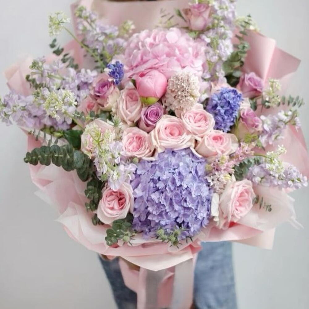 stock - 7 шт. pink hydrangeas - 1 шт. blue hydrangeas - 1 шт. рожева сезонна квітка - 10 шт. pink roses - 10 шт. сезонна зелень - 10 шт.
