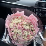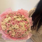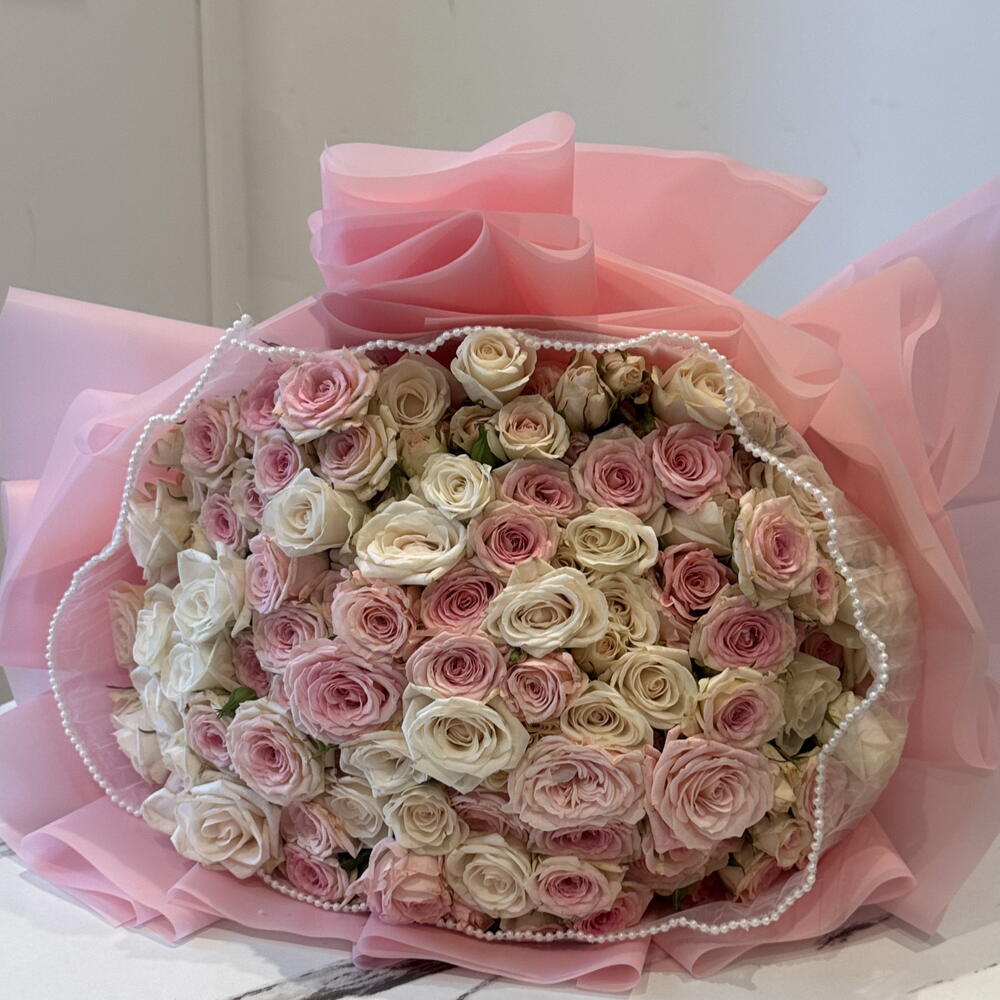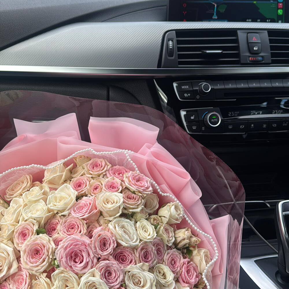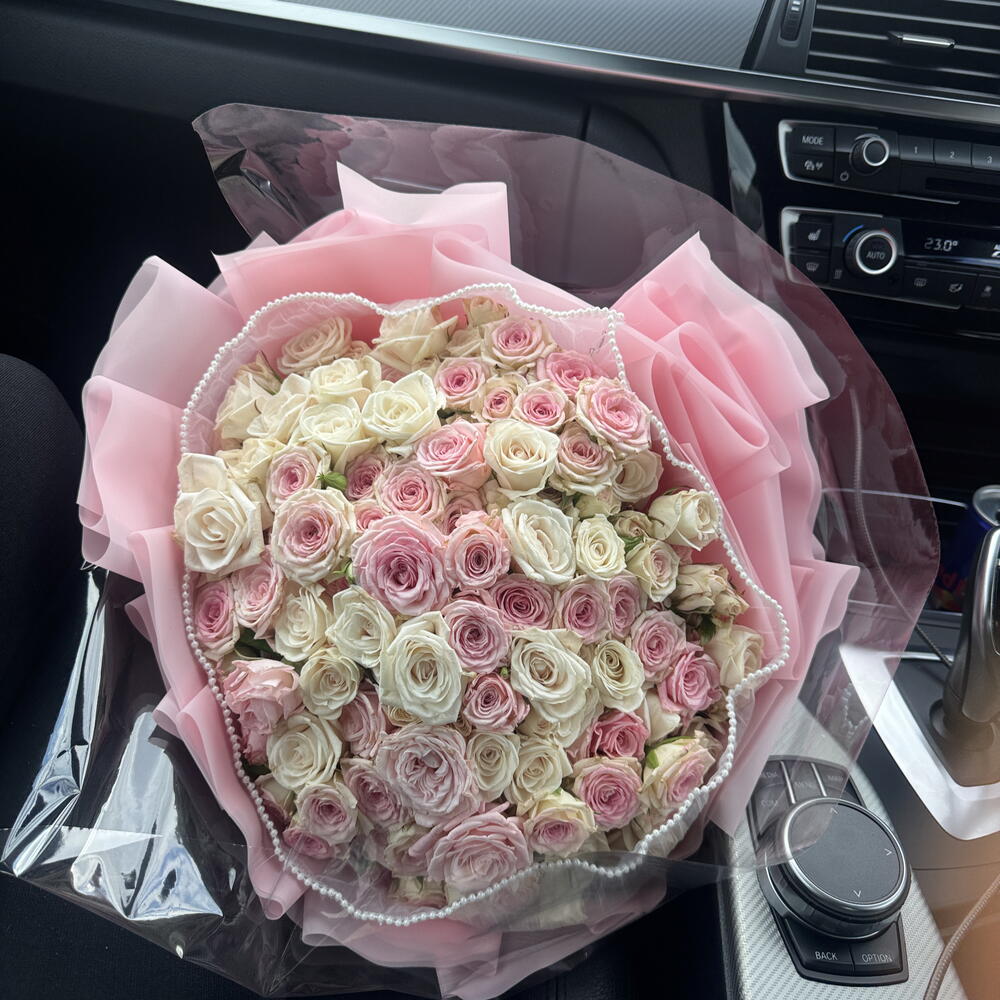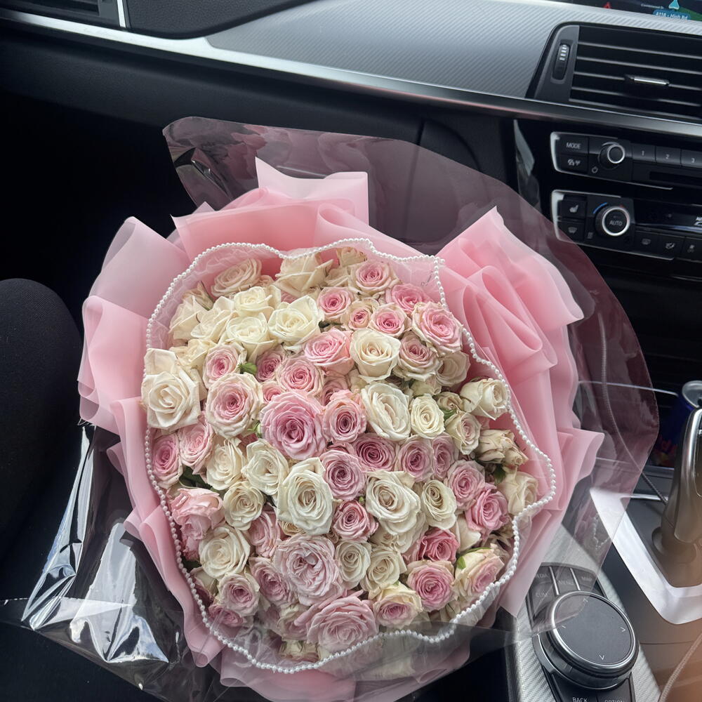 кремові троянди (основні базові квіти) - 30 шт. ніжно-рожеві спрей-троянди (менші зібрані троянди для фактури) - 20 шт.