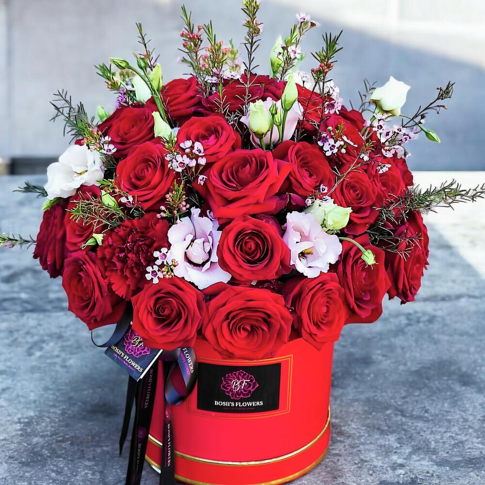 Red rose - 36 шт. pink lisianthus - 9 шт. бордові гвоздики - 15 шт. стебла воскової квітки - 10 шт. велика шляпна коробка - 1 шт.