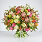 Featuring pink, orange, cream and ‘filled’ tulips, this bouquet takes tulips up a notch. Interspersed with stems of wax flowers, our florists have created a luxury design for the biggest occasions.