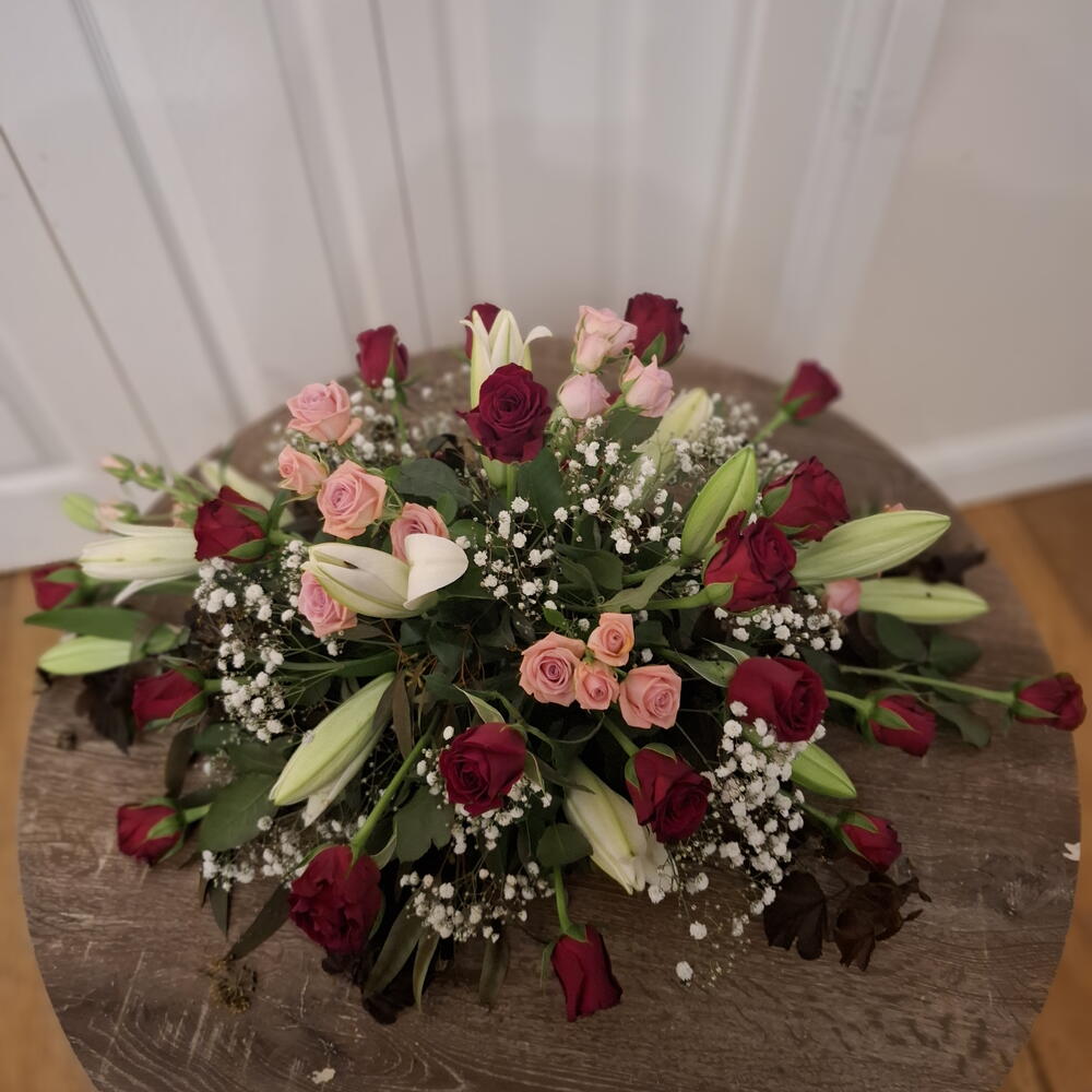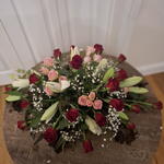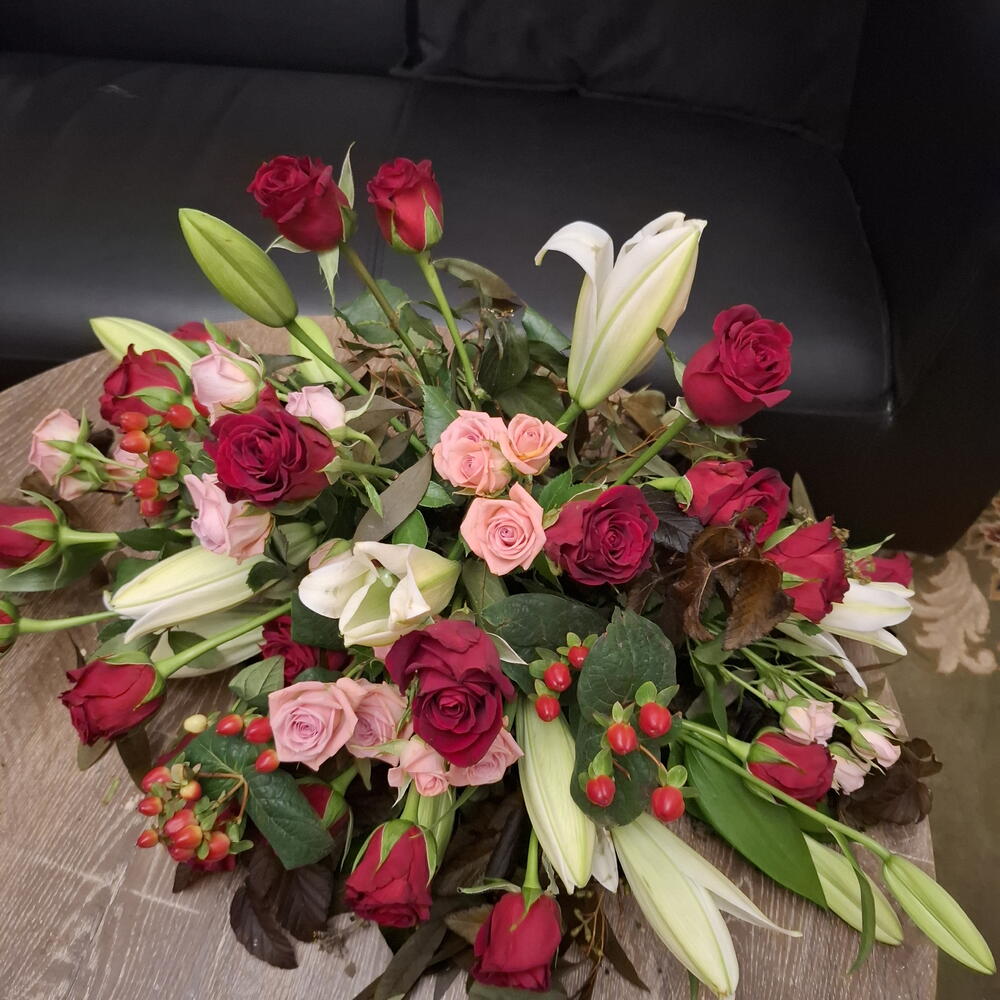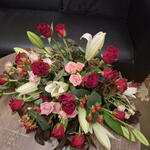 білі лілії - 4 шт. red roses - 18 шт. pink spray roses - 5 шт. гіперікум або гіпсофіла - 4 шт. 1.5 пінний блок і піддон - 1 шт.