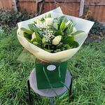 White lilies - 5 шт. Gypsophila - 3 шт. змішана зелень - 7 шт. white roses - 6 шт.