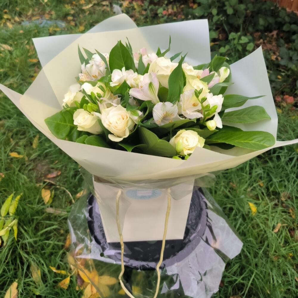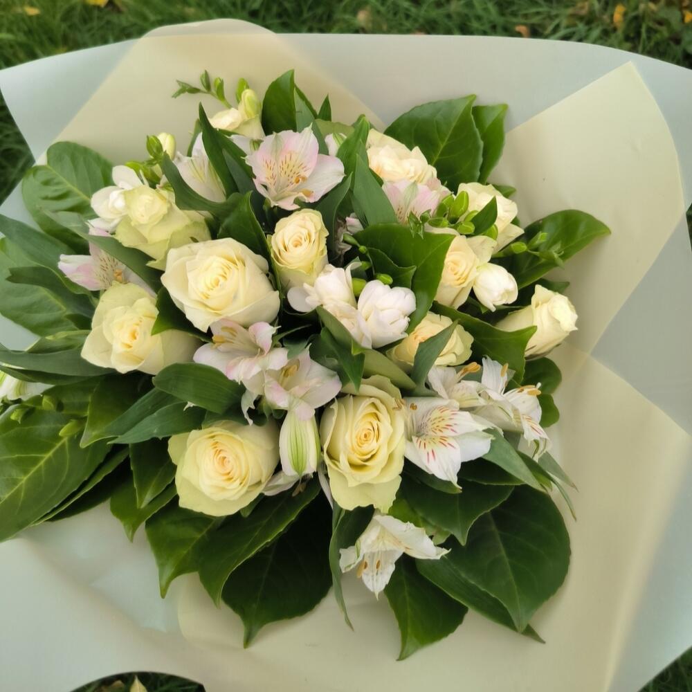 Букет з білих троянд та фрезій наповнений білими трояндами на довгих стеблах, свіжою білою фрезією, білою альстромерією та безліччю пишної зеленої листя. Упаковка «Аква», букет доставлений у воді. Букет, зображений на фото, великого розміру, ваш букет буде того ж стилю, але меншого розміру. Доставка наступного дня можлива. Зверніть увагу, що через сезонну наявність квітів, може знадобитися відрізняти окремі стебла від показаних. Ми можемо замінити квіти на аналогічні за стилем, якістю та вартістю.
