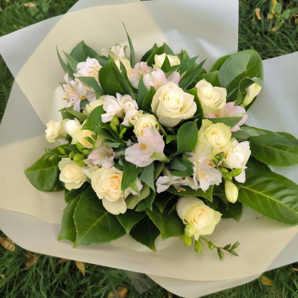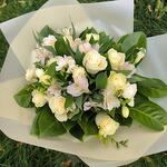 White freesia - 6 шт. white alstroemeria - 5 шт. змішана зелень - 7 шт. white roses - 5 шт.