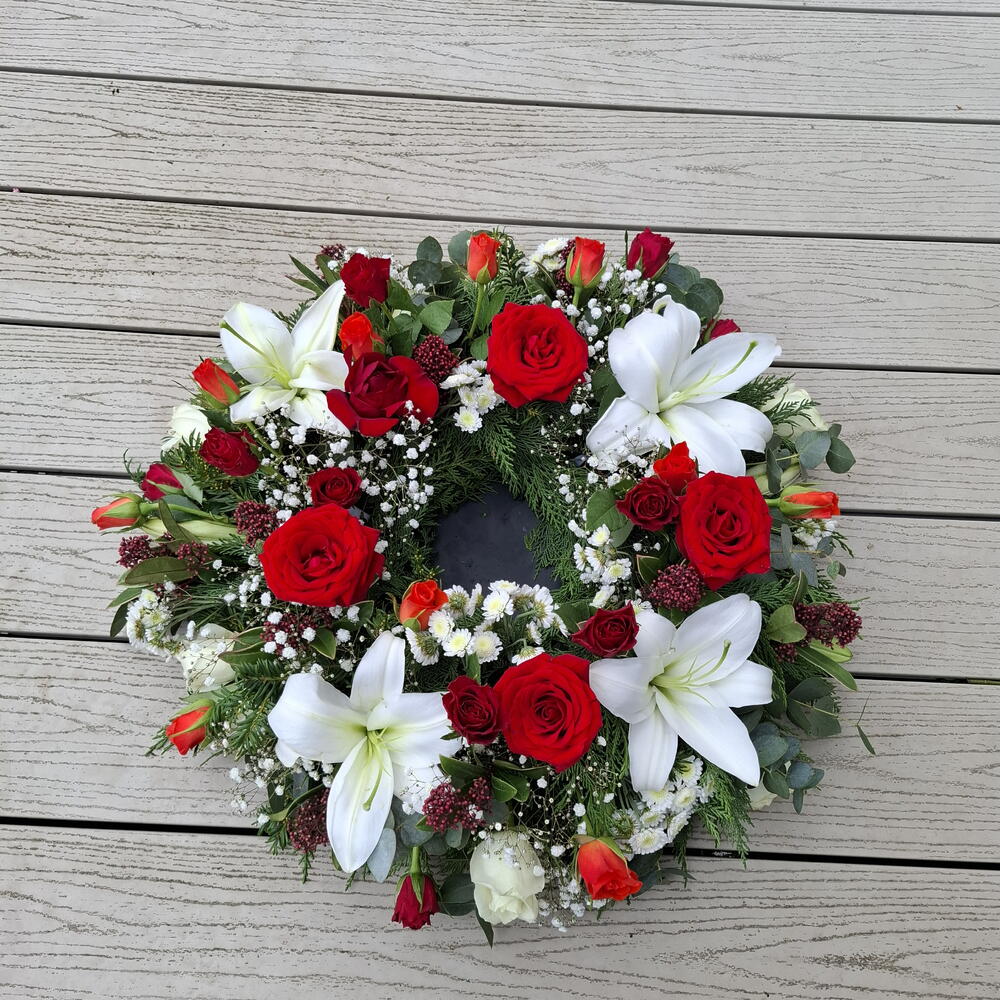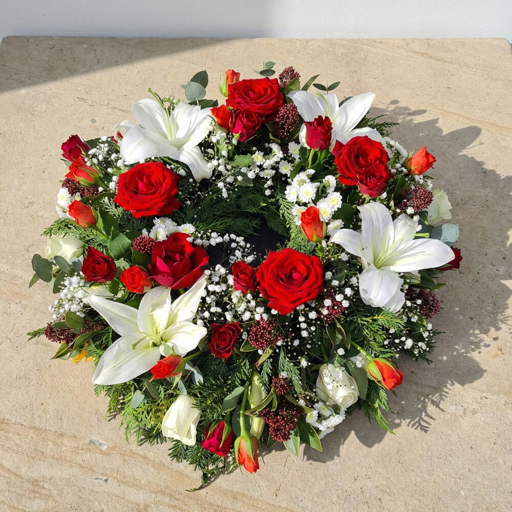 Цей проникливий ансамбль траурних квітів делікатно складений із бездоганних білих лілій та гіпсофіли, що створюють м’який контраст із пристрасними відтінками червоних і оранжевих троянд. Розміщений на вінковій основі з кільцем 12, композиція завершена освіжаючою сумішшю листя евкаліпта та міксом зелені, що додає відтінків природної краси. У складі: 4 лілії, 9 оранжевих троянд, 5 великих червоних троянд, 15 червоних троянд, 4 гіпсофіли, 7 листків евкаліпта, і додатково підкреслена міксом зелені, ця квіткова композиція дарує глибоке відчуття спокою і висловлює співчуття, любов та повагу в часи скорботи.