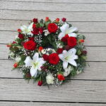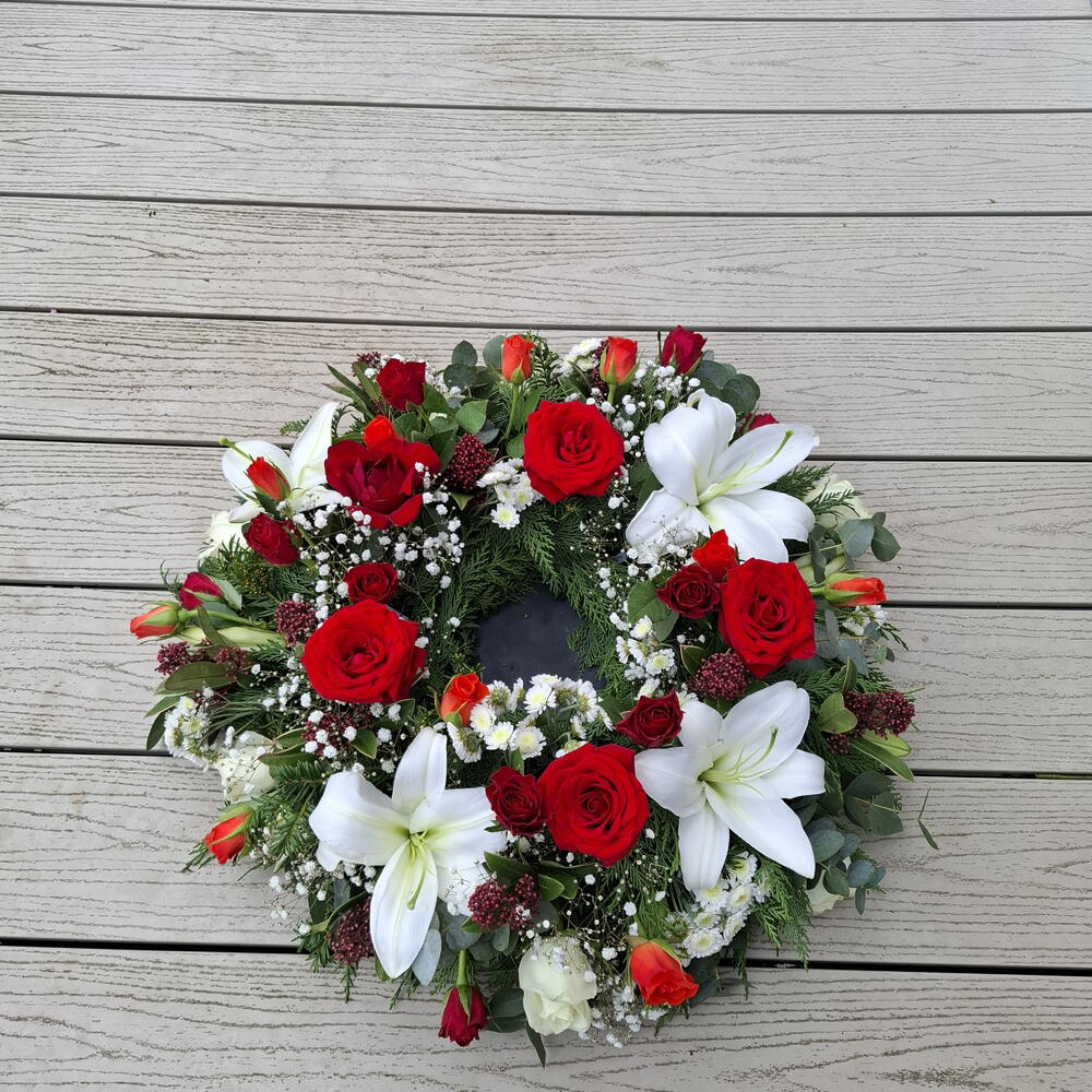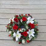 rose red - 15 шт. lily white - 4 шт. orange rose - 9 шт. gypsophila white - 4 шт. eucalyptus leaves - 7 шт. суміш зелені - 15 шт. червона троянда-велика - 5 шт. вінок 12" основне кільце - 1 шт.